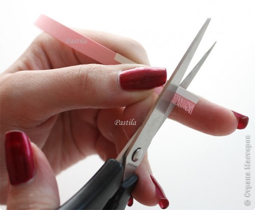 2. С лявата ръка придържаме, а с дясната режем. Трябва да се стараем възможно по на рядко да правим надрези. Може да си се стори, че цялото това рязане е безсмислено, но всъщност е необходимо търпение. Рязането трябва да е бавно и много внимателно, защото може случайно да отрежите цялата лента и тогава ще трябва да започвате отначало. Много е важно да подпирате ножицата за да не се изхлузи случайно.