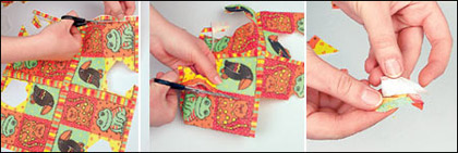 Изрежете от салфетката четири еднакви фрагмента, а за фон между тях - използвайте произволни лентички от същата.