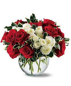 7. Добавете колорит и разнообразие към коледната украса като поставите вази с бели и червени цветя. Можете да откъснете и само цветовете и да ги оставите в големи стъклени купи (кръгъл не много голям аквариум също може да Ви служи за тази цел).