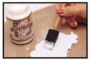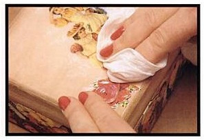 Взимаме с четката лепило (ако използвате Ц200 -трябва предварително да разредим с малко вода) и започваме леко и внимателно да намазваме задната повърхност на салфетката ( от средата към краищата), наблегнете хубаво на краищата. Може да намажете и самата повърхност с лепило, за да е здраво после.