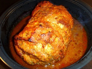 Покриваме съда с кухненско фолио, поставяме в студена фурна и печем – според оригиналната рецепта: на 250С за около 30 минути или на 180С за около 70-80 минути ( по 40 минути на кг/месо). Но бог знае защо моето месо след около 90 минути на 180С, като го резнах в каря, си беше все още кървящо сурово (сигурно ни е било по-съзряло прасенцето) и едва след около 2.5-3 часа на 180С вече беше ОК :) според нашите предпочитания (т.е. да не е розово отвътре).